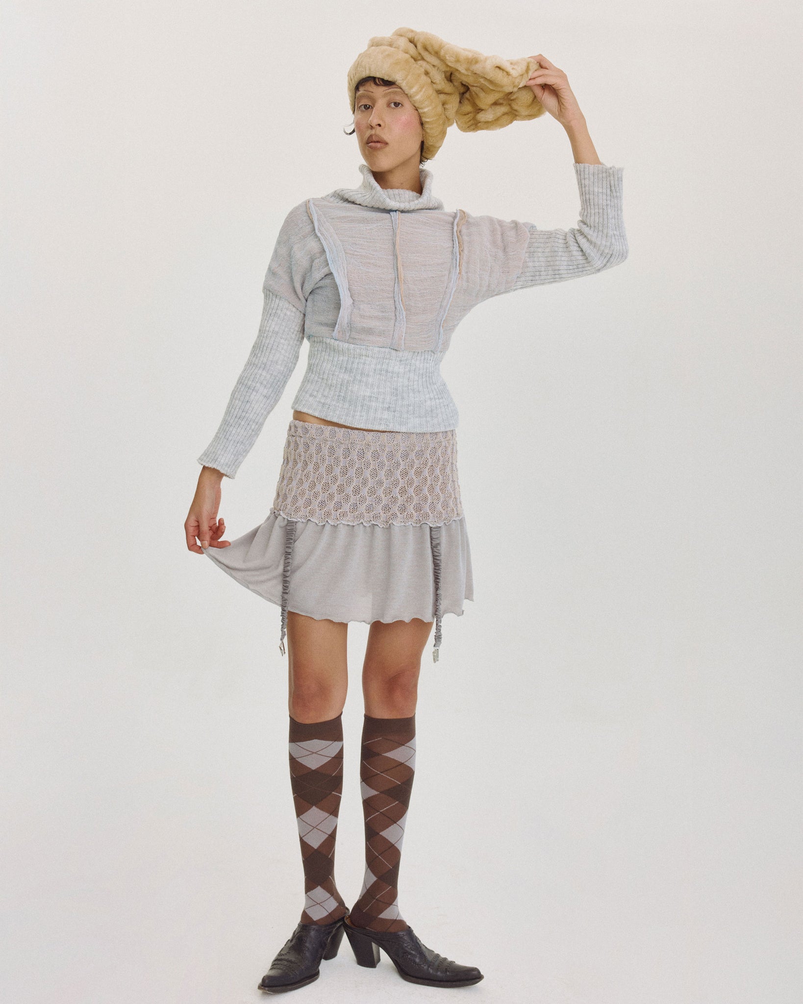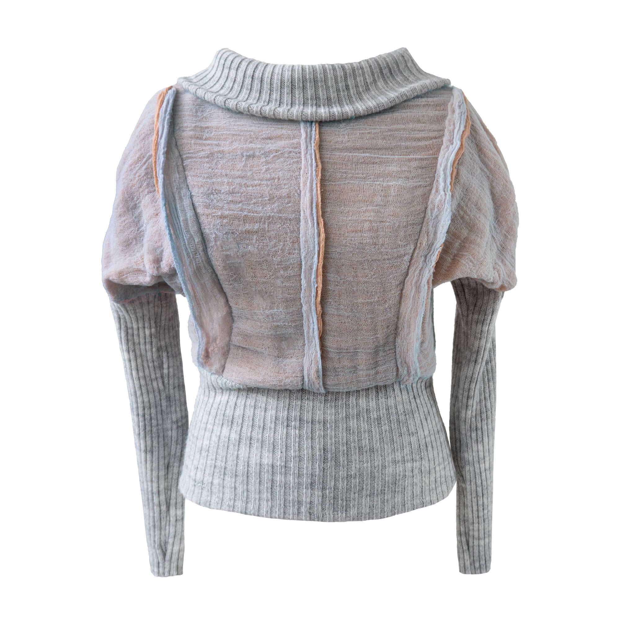 Warm long-sleeve top with a boatneck neckline, featuring recycled rib knit at the sleeves, neckline, and waist, while the main body in soft gauze with playful inserts. Cozy and comfortable, it offers a relaxed yet refined silhouette.