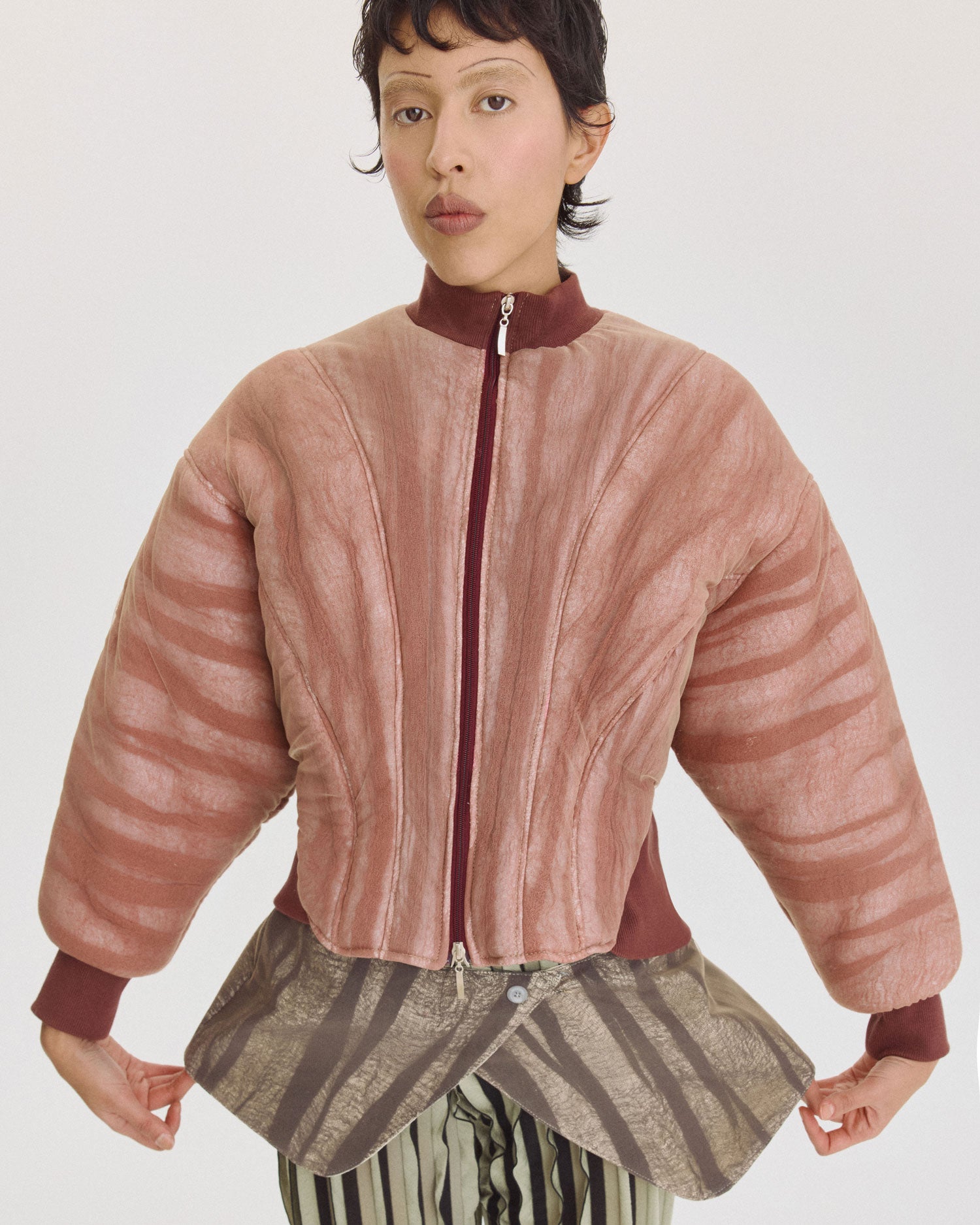 A new evolution of GAUZE — this puffer jacket is crafted from layered padding, gauze, and a transparent mesh outer fabric for added protection and texture. The design combines the relaxed cut of a bomber jacket with a streamlined, corset-inspired silhouette that accentuates the waist. Finished with soft jersey ribbing and a functional two-way zipper.