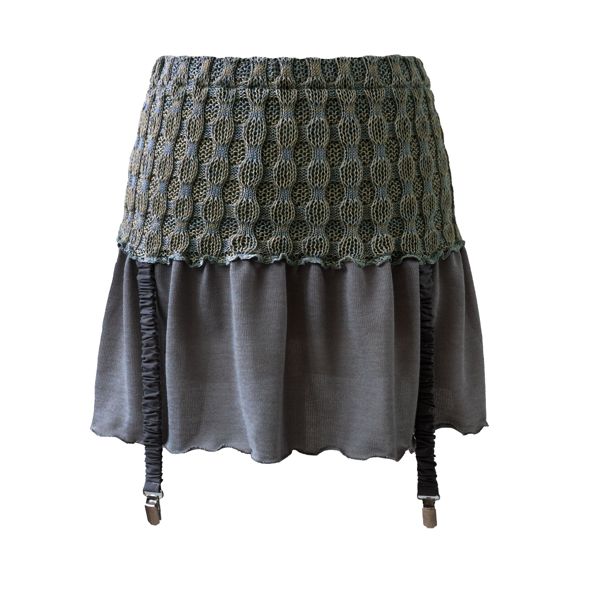 The mini skirt features a stretchy whimsical panel in recycled bubble knit, paired with lightweight repurposed jersey that forms the flared bottom. Adjustable suspenders add a playful, witty touch.